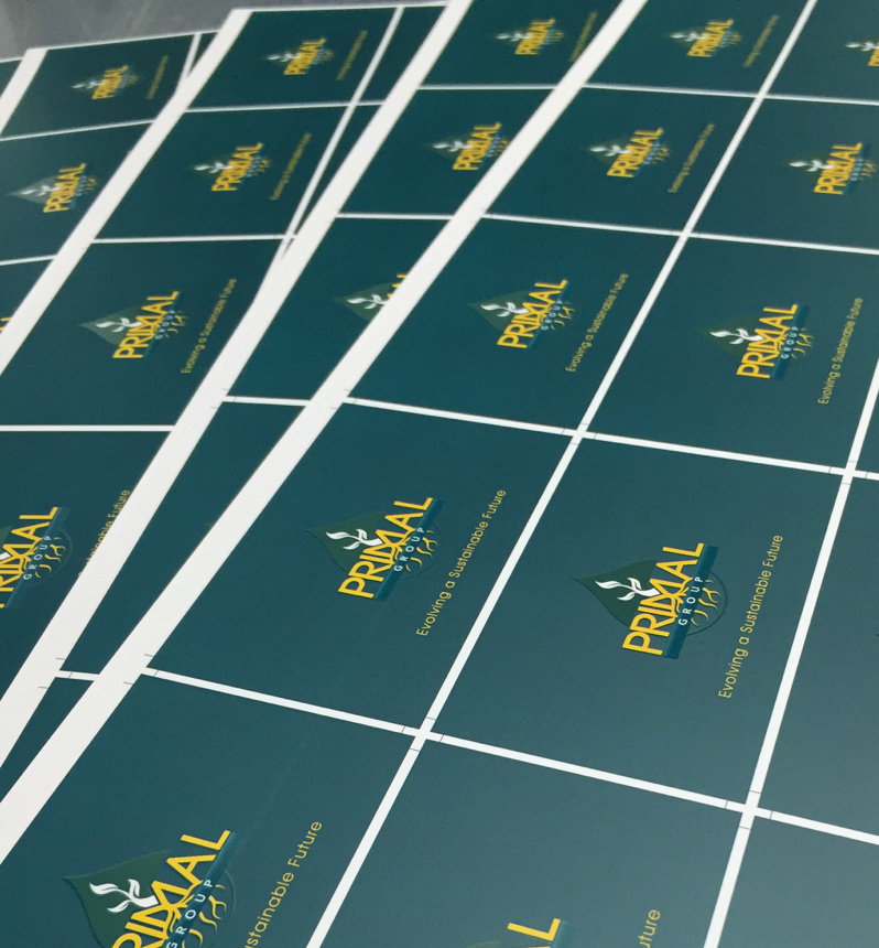 (Impresas a todo color frente sobre Couche Adhesivo blanco con Laminado lagarto brillante con corte recto)
