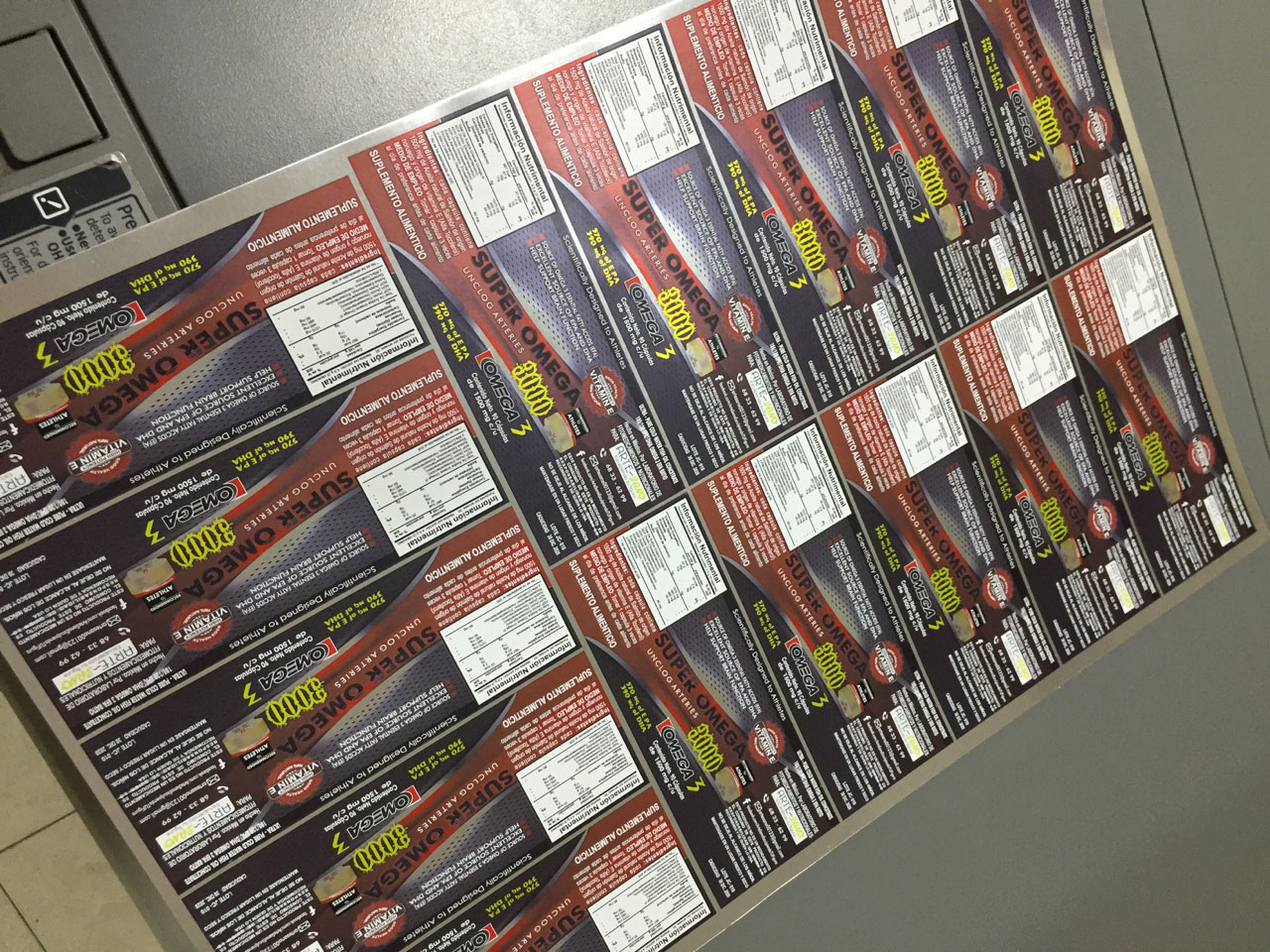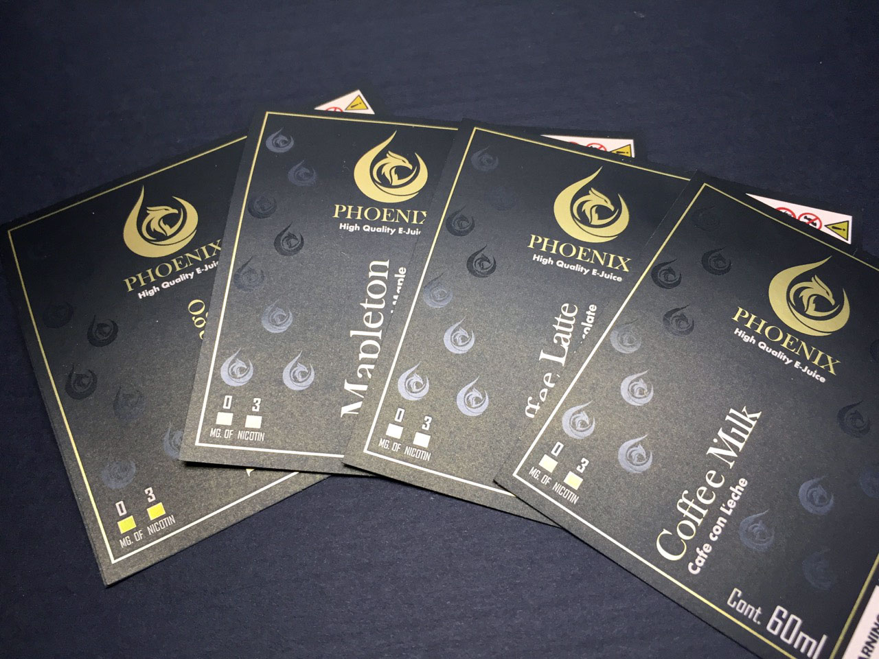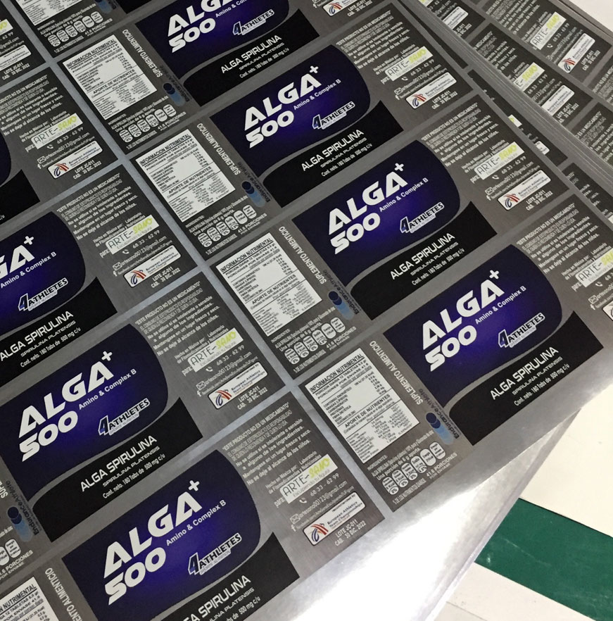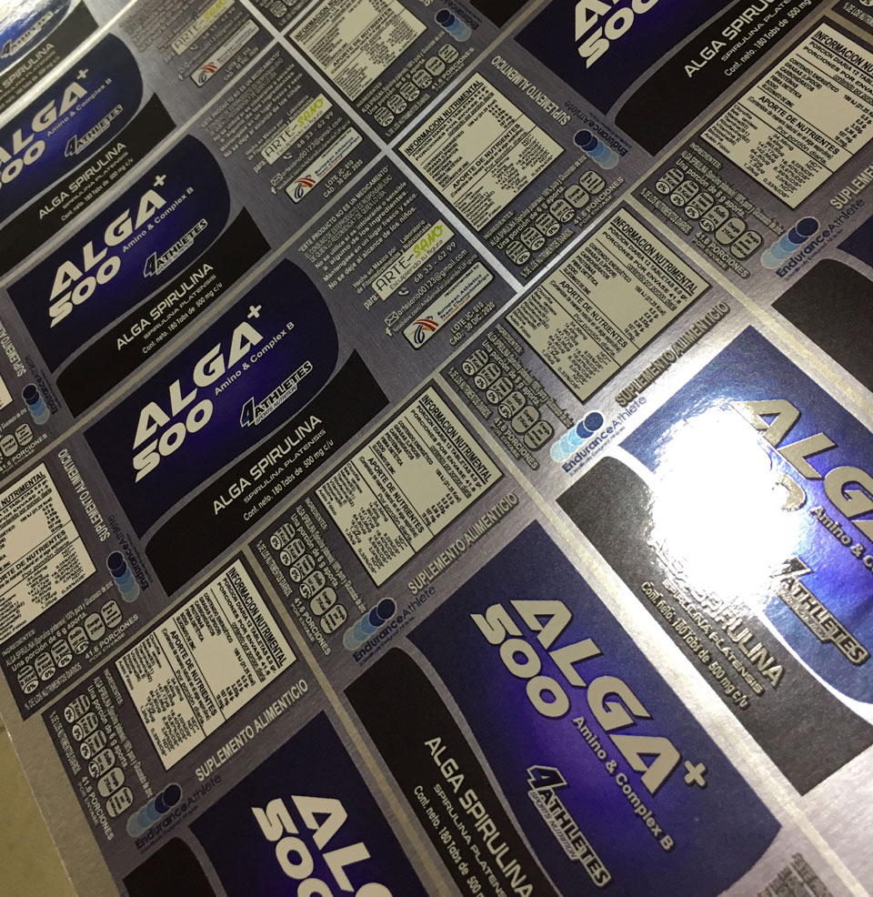 (Impresas a todo color frente sobre Adhesivo metalizado color Oro o plata mas tinta blanca mas laminado mate y barniz a registro con corte recto)