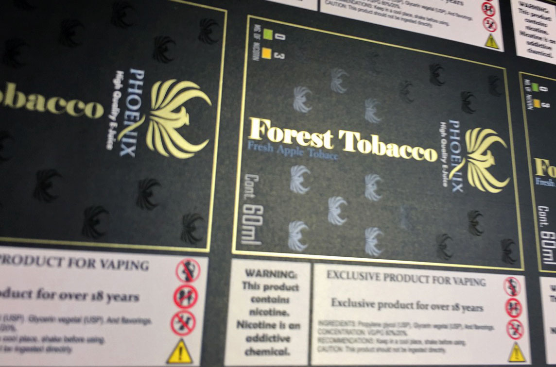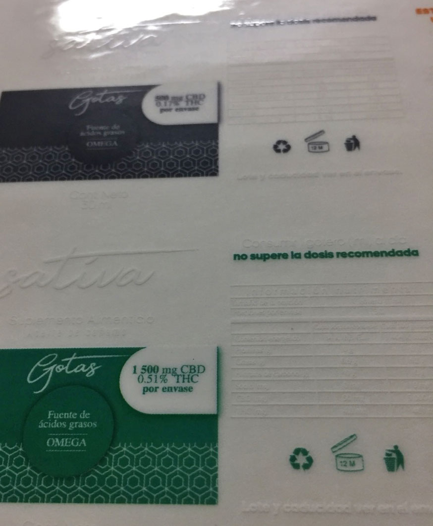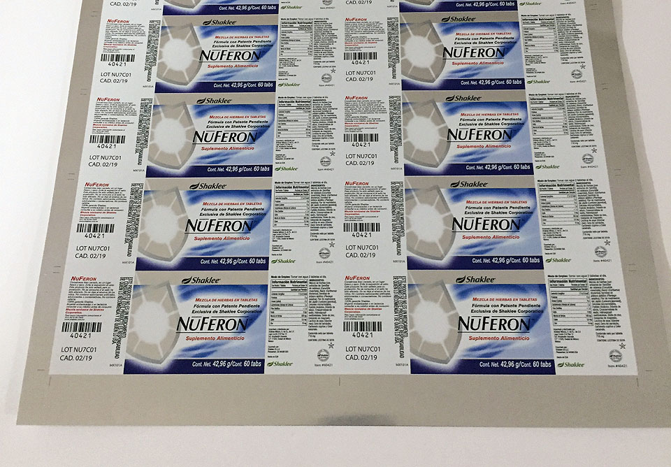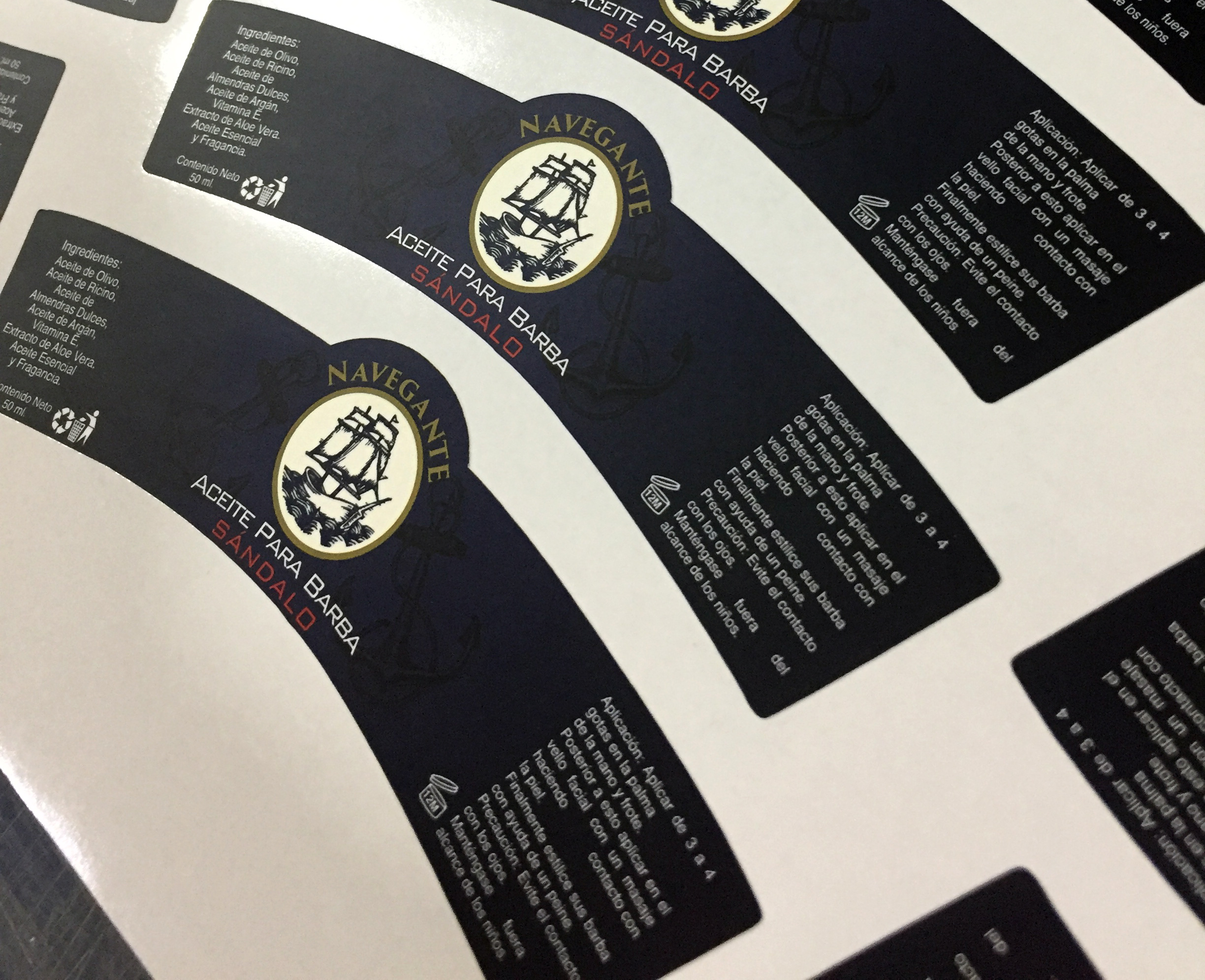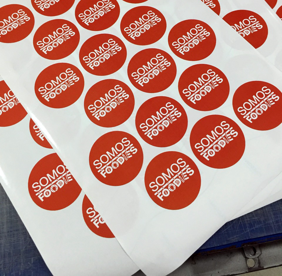(Impresas a todo color frente sobre Adhesivo metalizado color Oro o plata mas tinta blanca mas laminado mate y barniz a registro con corte recto)