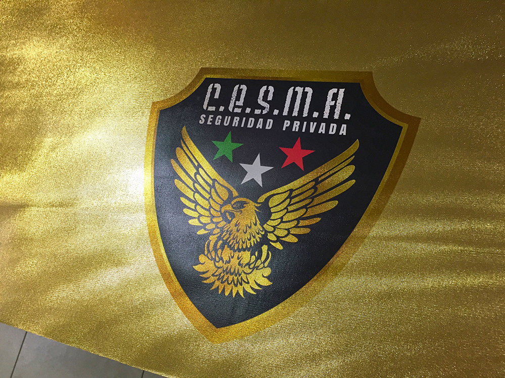 (Impresión de tintas base latex impresas sobre Tela placard Oro, ideal para Banners X, Roll Ups o Escenarios, excelente impresión de calidad con un acabado metalizado Oro)
