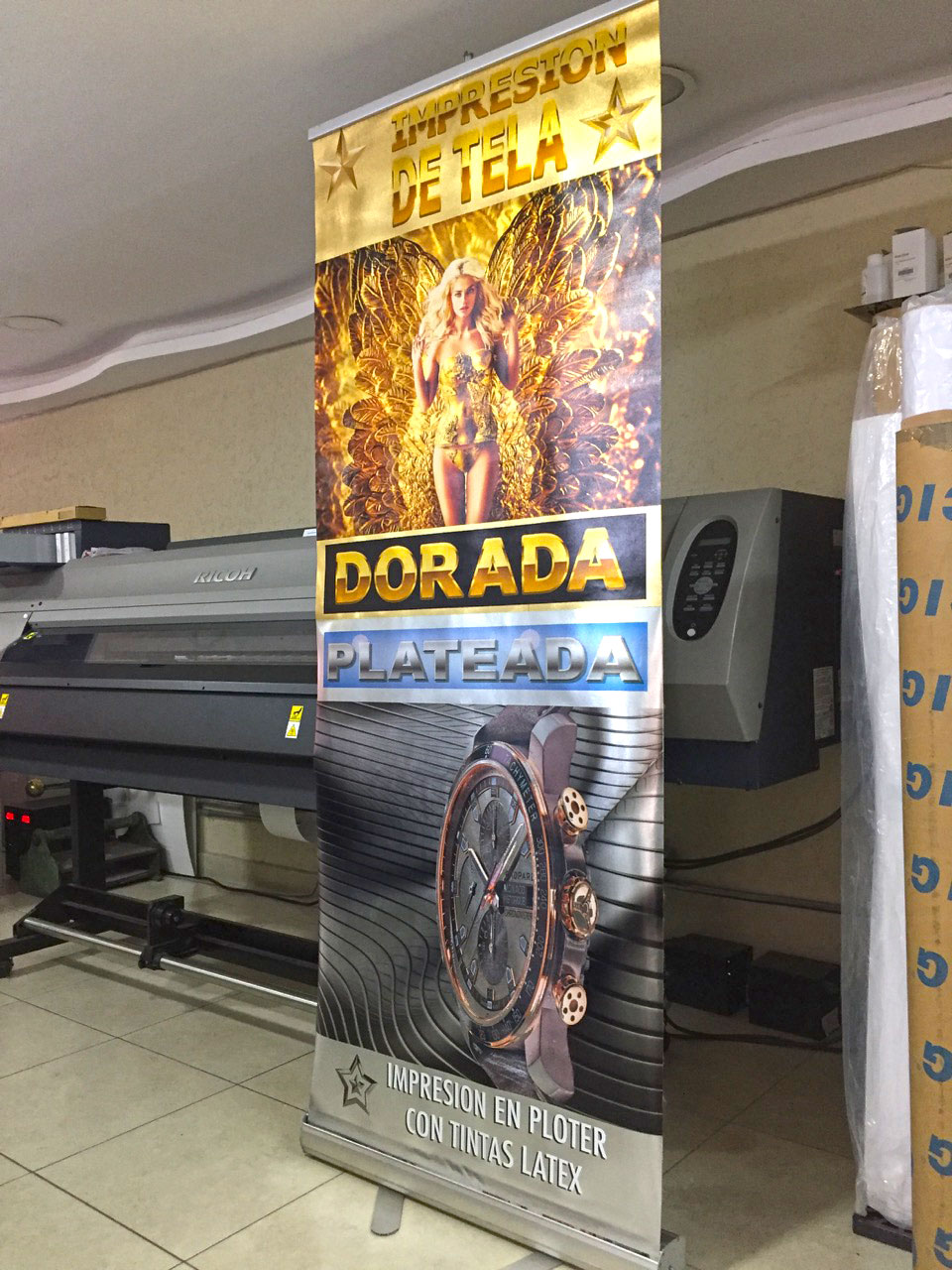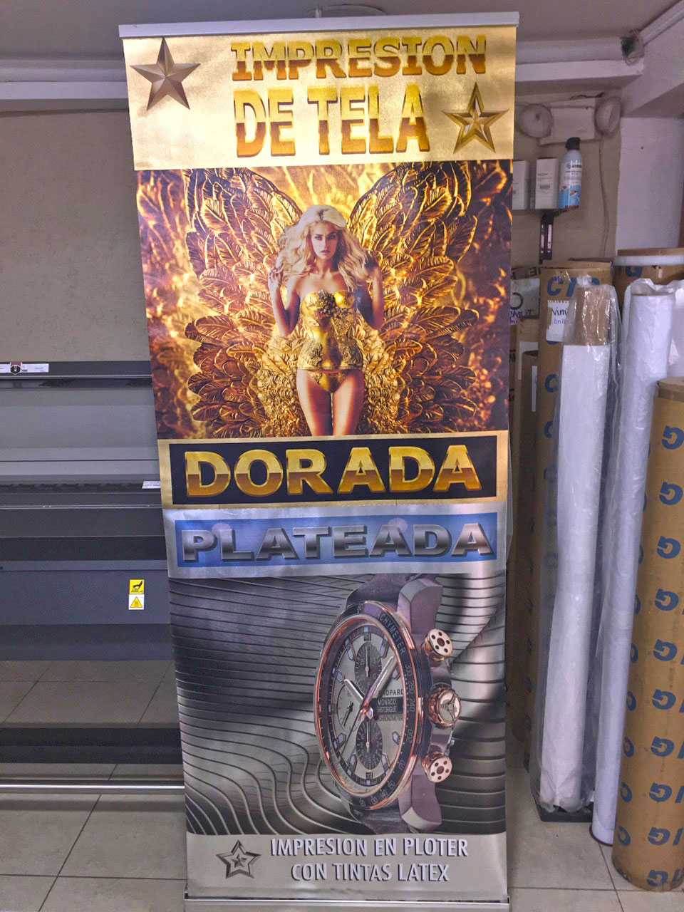 Impresión de tintas base latex impresas sobre Tela placard Oro o Plata mas tinta Blanca, ideal para Banners X, Roll Ups o Escenarios, excelente impresión de calidad con un acabado metalizado haciendo efectos increíbles con la tinta blanca)